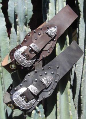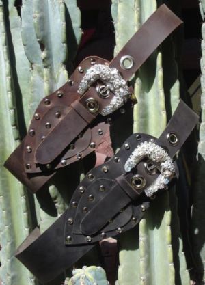 | Spooles OutLaw Belt™ Low Wasted Belt that Sits on your Hips Distressed Black and Brown Leather Each belt is handset with Swarovski ® Crystals and studs Hardware available in two styles One of a kind Crystallized Buckle Etched Poppy flower buckle with matching keeper and belt tab |