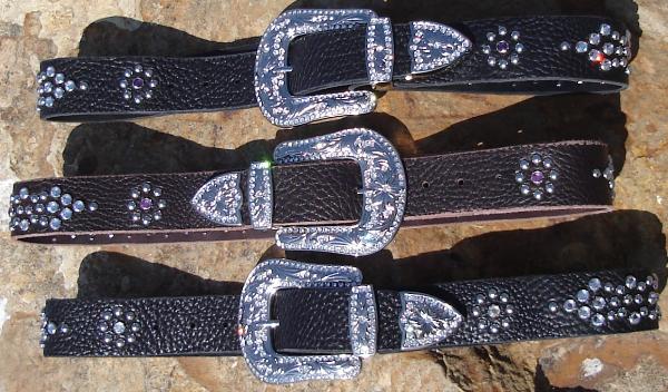 | Spooles Round - Up Belt™ Pattern mimics Spooles Elko purse strap pattern. Buckle and Belt tab are set with Crystals Available in Black, Brown, White, and Silver Leather. Combination of Studs and handset Swarovski ® Crystals. |