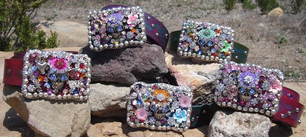 | Spooles Forsaken Rectangle Skull Buckles™ These buckles are handcrafted no two are alike Skull: Handcrafted and each are adorned differently Eyes are inlaid with Swarovski ®Crystals Buckles pictured are a representation of what we have in stock Attached Belt: Hand Painted and then distressed Handset with Swarovski ® Crystals and Studs |