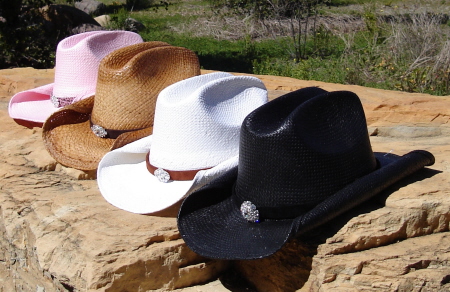 | Spooles Shapable Cowgirl Hats with Custom Jeweled Hat bands Available in: Black, White, Natural, and Pink Hat comes with a custom Suede hat band, which is adorned with a rhinestone crystal |