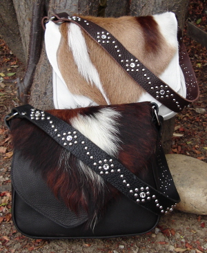 | Spooles Scout Purse Black or White Leather Please Note: Patterns on each Hide will be different. Purse strap is 26" : Studded and Handset with Clear 48ss Swarovski ® Crystals in our Spoole Diamond™ pattern Attributes: Flap closes with a heavy duty magnet Inside: zipper pocket, cell phone pocket and one additional pocket |